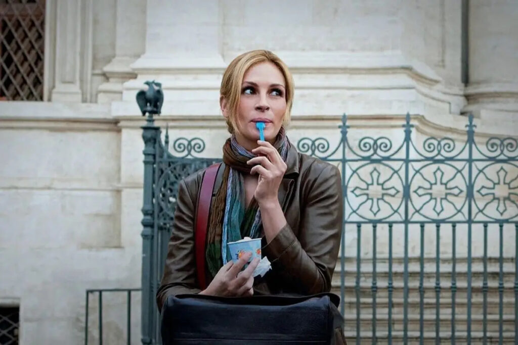 Julia Roberts embarca em uma jornada de autoconhecimento que passa pela Itália, Índia e Bali. E a primeira parada, recheada de massas e pizzas, é puro amor — tanto por si mesma quanto pela comida.